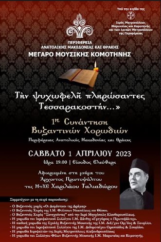 Η Περιφέρεια Ανατολικής Μακεδονίας και Θράκης παρουσιάζει στο Μέγαρο Μουσικής Κομοτηνής την 1η Συνάντηση Βυζαντινών Χορωδιών με τίτλο: «Τήν ψυχωφελῆ πληρώσαντες Τεσσαρακοστήν…», το Σάββατο 1 Απριλίου 2023 στις 7 το βράδυ.