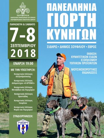 Σε σημείο αναφοράς του Έβρου, της Περιφέρειας Ανατολικής Μακεδονίας και Θράκης και πανελλαδικά για το κυνήγι, μετατρέπεται το Σιδηρώ Έβρου με την «Πανελλήνια Γιορτή Κυνηγών» που θα πραγματοποιηθεί την Παρασκευή 7 και το Σάββατο 8 Σεπτεμβρίου 2018.