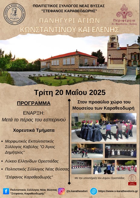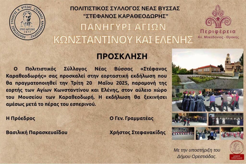 Ο Πολιτιστικός Σύλλογος Νέας Βύσσας «Στέφανος Καραθεοδωρής» σας προσκαλεί με χαρά στην εορταστική εκδήλωση που διοργανώνει με την ευκαιρία της μνήμης των Αγίων Ισαποστόλων Κωνσταντίνου και Ελένης, την Τρίτη 20 Μαΐου 2025, στον αύλειο χώρο του Μουσείου των Καραθεοδωρή.