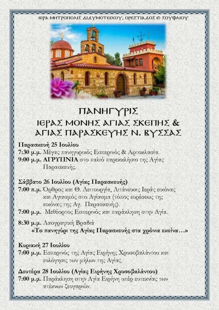 ΠΑΝΗΓΥΡΙΣ ΙΕΡΑΣ ΜΟΝΗΣ ΑΓΙΑΣ ΣΚΕΠΗΣ & ΑΓΙΑΣ ΠΑΡΑΣΚΕΥΗΣ Ν. ΒΥΣΣΑΣ Επί τη εορτή της Αγίας Οσιοπαρθενομάρτυρος ΠΑΡΑΣΚΕΥΗΣ