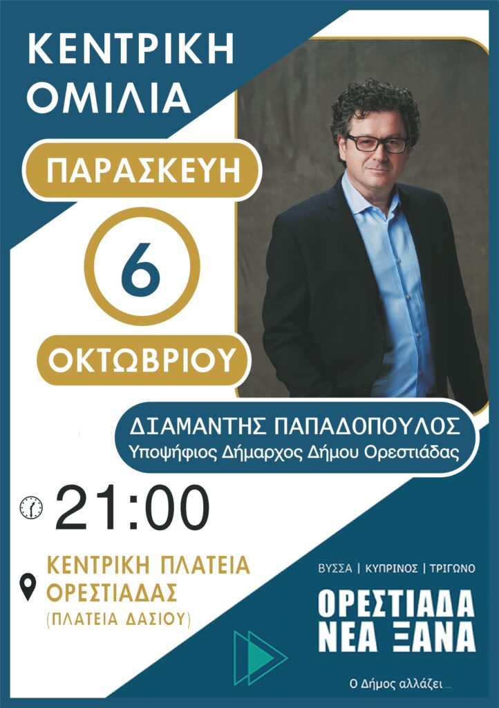 Σας προσκαλούμε στην κεντρική προεκλογική ομιλία του υποψηφίου Δημάρχου Ορεστιάδας, Διαμαντή Παπαδόπουλου.