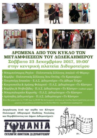 Το Σάββατο 23 Δεκεμβρίου και από ώρα 7 μ.μ. στην κεντρική πλατεία Διδυμοτείχου θα παρουσιαστούν δρώμενα του κύκλου των μεταμφιέσεων του Δωδεκαημέρου από τους συλλόγους: