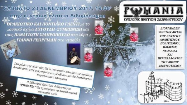 Παραδοσιακά Χριστούγεννα στο Διδυμότειχο με δρώμενα από τον κύκλο των μεταμφιέσεων του Δωδεκαημέρου διοργανώνουν, υπό την αιγίδα του Κέντρου Πολιτισμού Αθλητισμού Παιδείας Νεολαίας και Περιβάλλοντος Δήμου Διδυμότειχου, ο Πολιτιστικός Λαογραφικός Σύλλογος Διδυμότειχου “Το Κάστρο” και ο Σύλλογος Ποντίων Διδυμότειχου “Ρωμανία”.