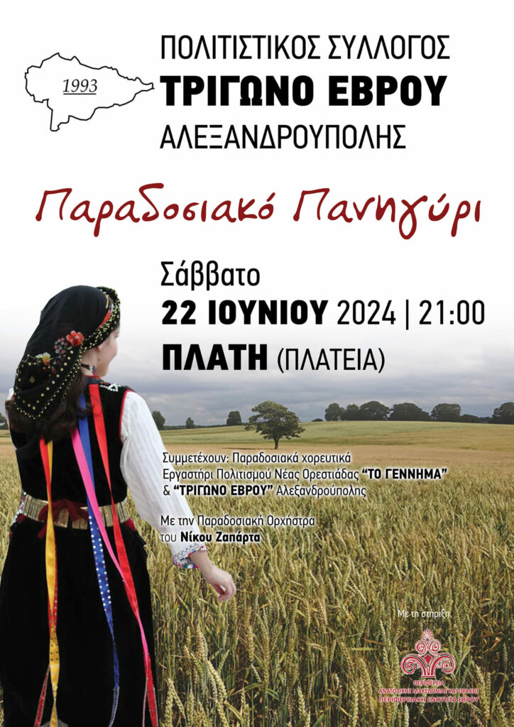 Παραδοσιακό Πανηγύρι διοργανώνει στην Πλάτη ο Πολιτιστικός Σύλλογος “Τρίγωνο Έβρου” Αλεξανδρούπολης το Σάββατο 22 Ιουνίου 2024 στις 9 το βράδυ.