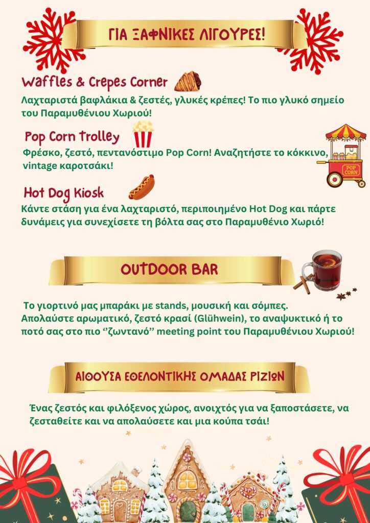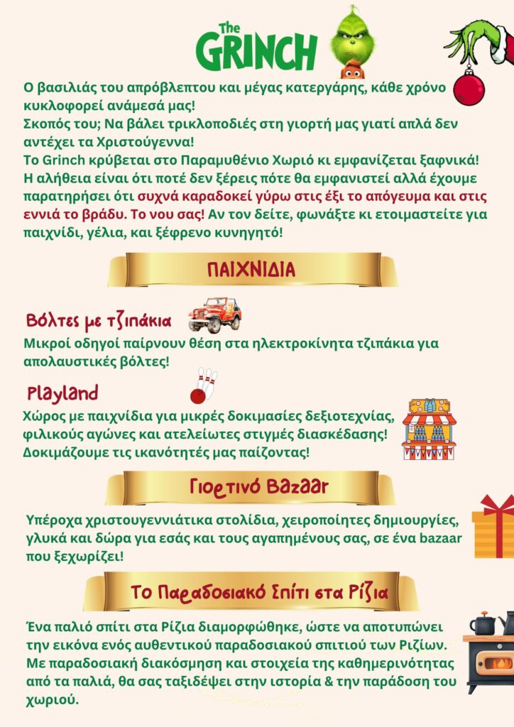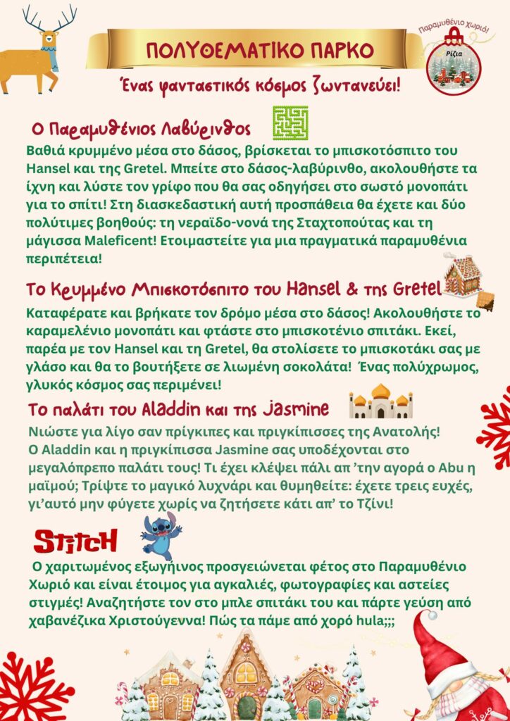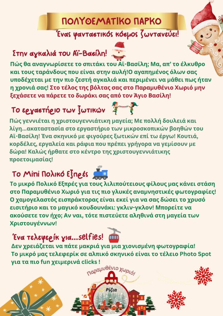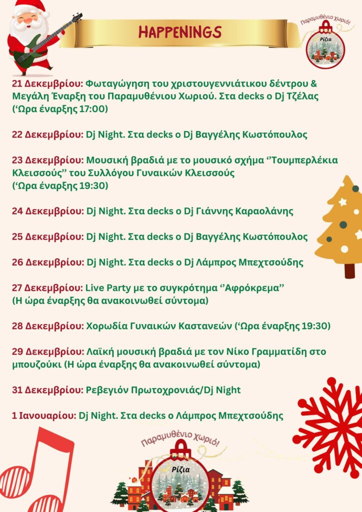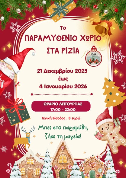 Τα Ρίζια μεταμορφώνονται και πάλι σε ένα «Παραμυθένιο Χωριό» για τις γιορτές, υποδέχονται μικρούς και μεγάλους από τις 21 Δεκεμβρίου 2025 έως 4 Ιανουαρίου 2026 από τις 17:00 – 22:00