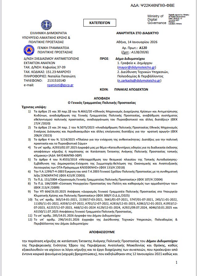 Παρατείνεται η κήρυξη του Δήμου Διδυμοτείχου σε Κατάσταση Έκτακτης Ανάγκης Πολιτικής Προστασίας, με απόφαση της Γενικής Γραμματείας Πολιτικής Προστασίας.