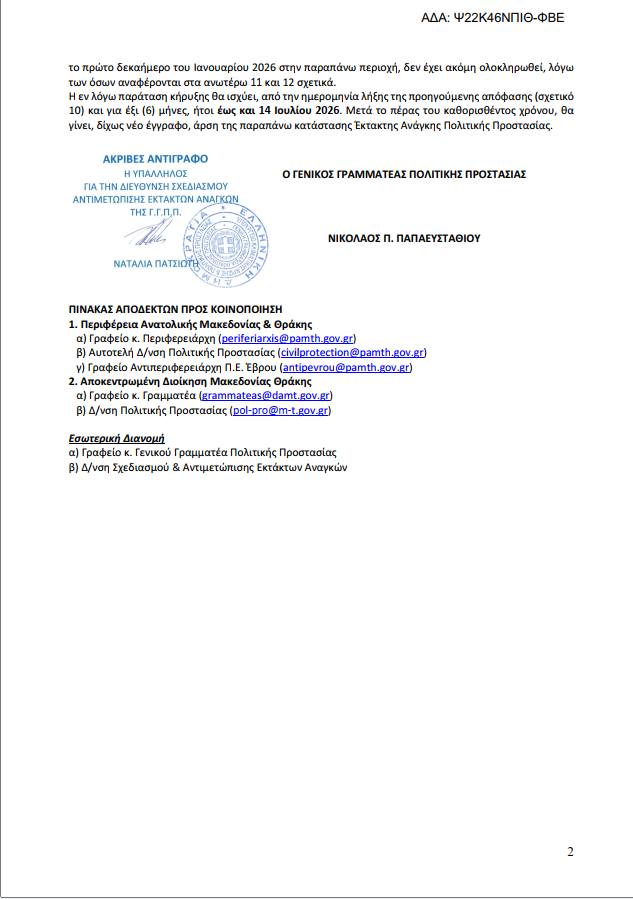 Σύμφωνα με την απόφαση με αριθμό πρωτοκόλλου Α120, που εκδόθηκε στις 14 Ιανουαρίου 2026, η παράταση ισχύει έως και τις 14 Ιουλίου 2026. Ο λόγος της παράτασης είναι οι συνεχιζόμενες συνέπειες από τα έντονα καιρικά φαινόμενα που έπληξαν την περιοχή, και συγκεκριμένα οι ισχυρές βροχοπτώσεις που σημειώθηκαν τόσο στις 12 Ιανουαρίου 2021 όσο και κατά το πρώτο δεκαήμερο του Ιανουαρίου 2026.