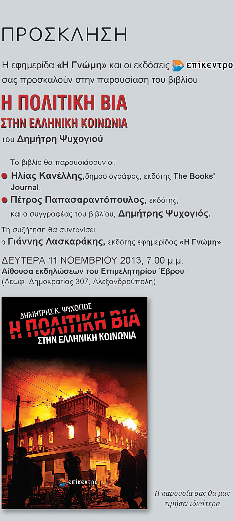 Παρουσίαση του βιβλίου «Η ΠΟΛΙΤΙΚΗ ΒΙΑ ΣΤΗΝ ΕΛΛΗΝΙΚΗ ΚΟΙΝΩΝΙΑ» από την εφημερίδα Γνώμης και τις εκδόσεις ΕΠΙΚΕΝΤΡΟ