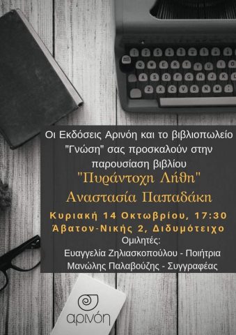 Οι εκδόσεις Αρινόη σε συνεργασία με το βιβλιοπωλείο “Γνώση” σας προσκαλούν στην παρουσίαση της ποιητικής συλλογής, της συγγραφέως – ποιήτριας Αναστασία Παπαδάκη “Πυράντοχη Λήθη”.