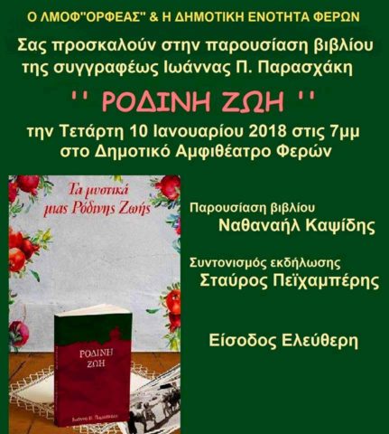 Ο Λαογραφικός Όμιλος Φερών “Ορφέας” και η Δημοτική Ενότητα Φερών σας προσκαλούν στην παρουσίαση του βιβλίου “Ρόδινη Ζωή” της συγγραφέως Ιωάννας Π. Παρασχάκη.