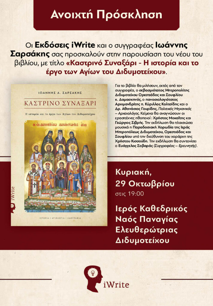 Η Ιερά Μητρόπολη Διδυμοτείχου, Ορεστιάδος και Σουφλίου, οι Εκδόσεις iWrite και ο συγγραφέας Ιωάννης Σαρσάκης, σας προσκαλούν στην παρουσίαση του νέου του βιβλίου, με τίτλο «Καστρινό Συναξάρι – Η ιστορία και το έργο των Αγίων του Διδυμοτείχου».