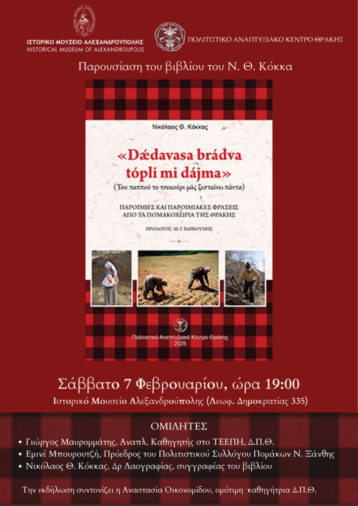 Το Ιστορικό Μουσείο Αλεξανδρούπολης και το Πολιτιστικό Αναπτυξιακό Κέντρο Θράκης συνδιοργανώνουν παρουσίαση του νέου βιβλίου του Νικολάου Θ. Κόκκα με τίτλο: «Dǽdavasa brádva tópli mi dájma» (Του παππού το τσεκούρι μάς ζεσταίνει πάντα). Παροιμίες και παροιμιακές φράσεις από τα πομακοχώρια της Θράκης. Η παρουσίαση του βιβλίου θα γίνει στην Αλεξανδρούπολη το Σάββατο 7 Φεβρουαρίου και ώρα 19:00 στο Ιστορικό Μουσείο Αλεξανδρούπολης (Λεωφόρος Δημοκρατίας 335).