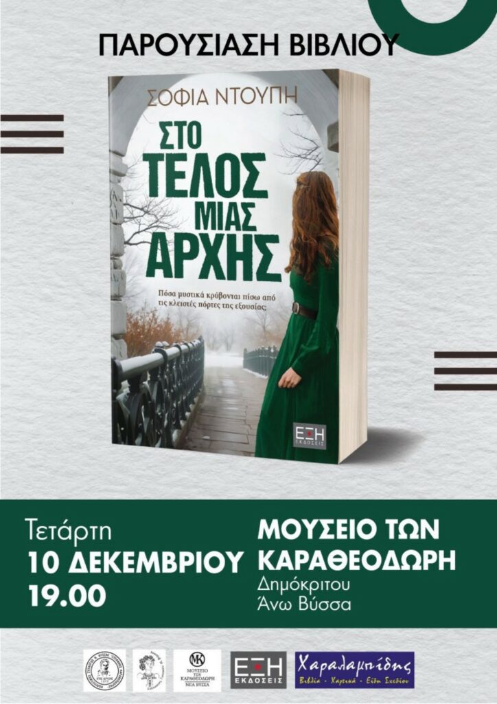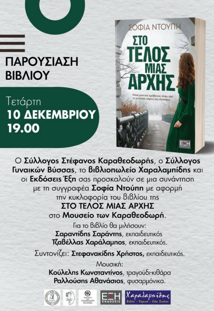 Ο Πολιτιστικός Σύλλογος Νέας Βύσσας “Στέφανος Καραθεοδωρής”, ο Σύλλογος Γυναικών Βύσσας, το Βιβλιοπωλείο Χαραλαμπίδης και οι Εκδόσεις Έξη σας προσκαλούν με ιδιαίτερη χαρά στη παρουσίαση του νέου βιβλίου της συγγραφέως Σοφίας Ντούπη, με τίτλο: «Στο Τέλος Μιας Αρχής».