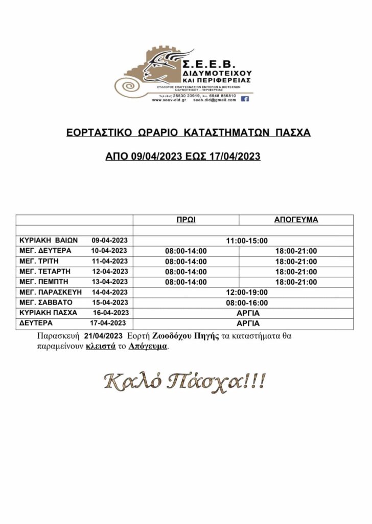 Ο Σύλλογος Επαγγελματιών Εμπόρων και Βιοτεχνών Διδυμοτείχου και Περιφέρειας ανακοίνωσε το πασχαλινό εορταστικό ωράριο των καταστημάτων του Διδυμοτείχου