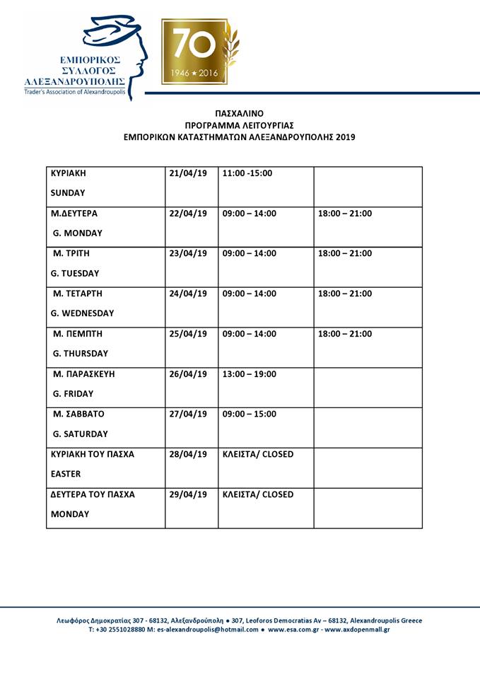 Ο Εμπορικός Σύλλογος Αλεξανδρούπολης ανακοίνωσε το πασχαλινό εορταστικό ωράριο των καταστημάτων της Αλεξανδρούπολης, το οποίο εφαρμόζεται από την Κυριακή των Βαΐων 21 Απριλίου μέχρι και τη Δευτέρα του Πάσχα 29 Απριλίου 2019.