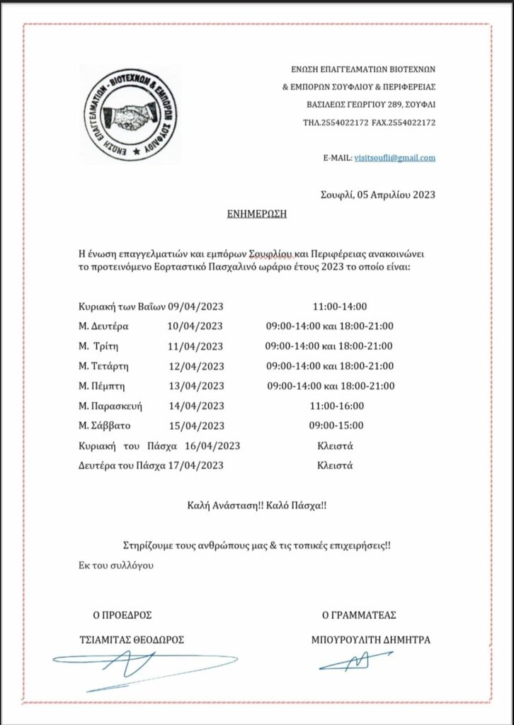 Το προτεινόμενο πασχαλινό εορταστικό ωράριο 2023 των καταστημάτων γνωστοποίησε η Ένωση Επαγγελματιών Βιοτεχνών και Εμπόρων Σουφλίου και Περιφέρειας