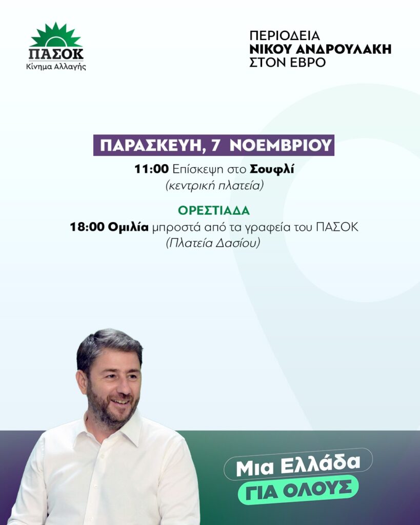 Ο Πρόεδρος του ΠΑΣΟΚ-Κινήματος Αλλαγής, Νίκος Ανδρουλάκης, συνοδευόμενος από και μέλη της Κ.Π.Ε. της Ν.Ε. και στελεχών του ΠΑΣΟΚ-Κινήματος Αλλαγής, θα πραγματοποιήσουν Περιοδεία στον Νομό Έβρου.