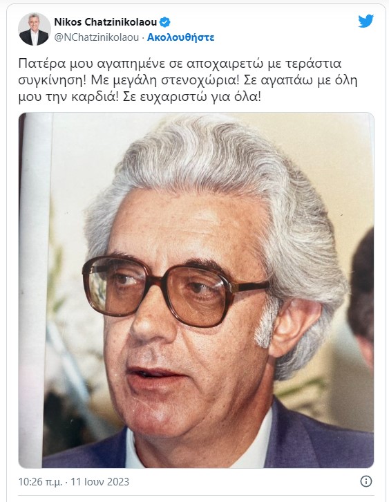 «Πατέρα μου αγαπημένε σε αποχαιρετώ με τεράστια συγκίνηση! Με μεγάλη στενοχώρια! Σε αγαπάω με όλη μου την καρδιά! Σε ευχαριστώ για όλα!» έγραψε ο Νίκος Χατζηνικολάου στο Twitter.