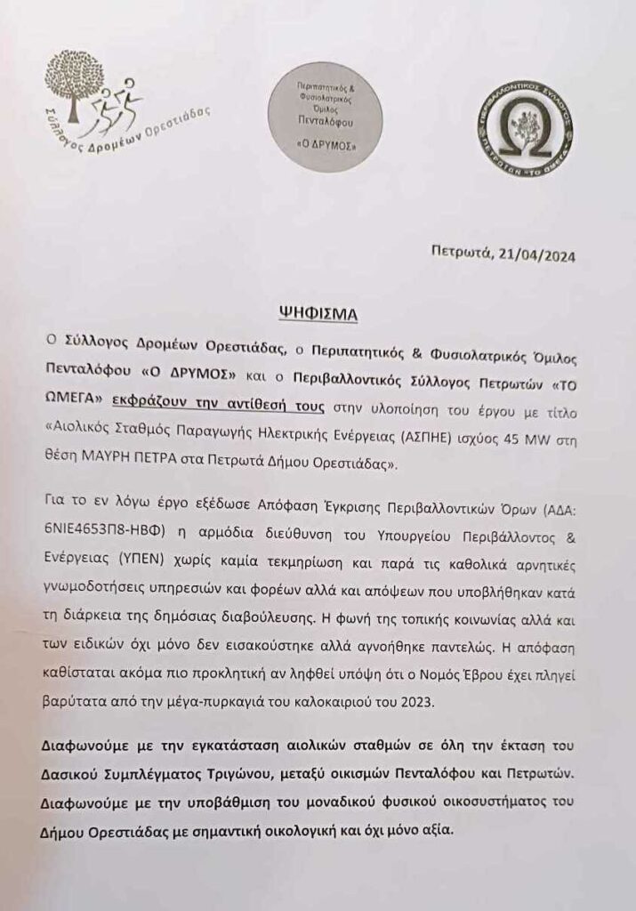 Δυνατό “Όχι” στην εγκατάσταση ανεμογεννητριών σε ένα από τους ελάχιστους απείραχτους και πολυτιμότατους δασικούς πνεύμονες του Έβρου, το μοναδικό στην περιοχή του Δήμου Ορεστιάδας, φώναξε η τοπική κοινωνία την Κυριακή 21 Απριλίου σε συγκέντρωση διαμαρτυρίας στα Πετρωτά.