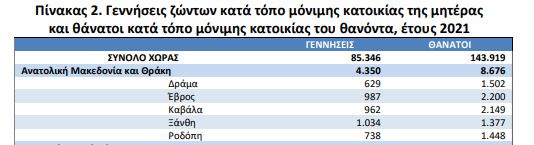 Τονίζεται ότι σε μόλις μία Περιφέρεια τις χώρας φαίνεται οι γεννήσεις να υπερβαίνουν των θανάτων με την συνολική εικόνα να παρουσιάζει φανερά το πρόβλημα του δημογραφικού. Σε όλη την Ελλάδα οι γεννήσεις το 2021 ήταν 85.346 και οι θάνατοι 143.919.