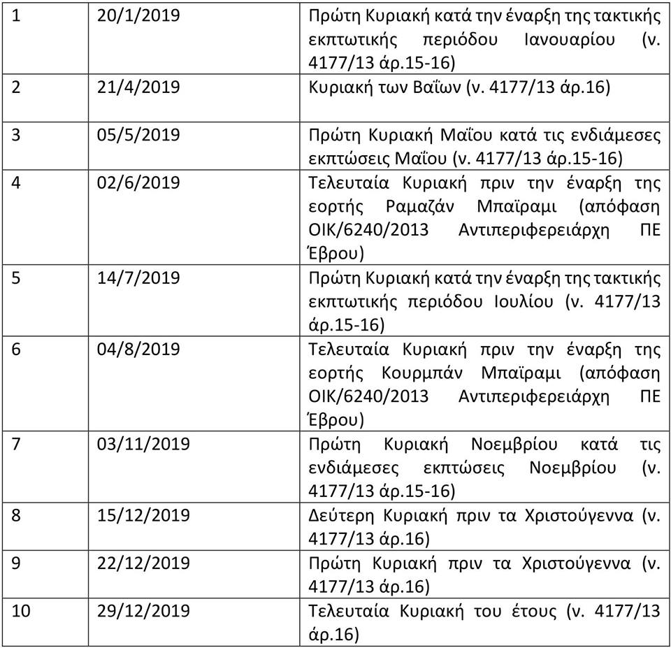 Από το Τμήμα Εμπορίου και Τουρισμού της Διεύθυνσης Ανάπτυξης της Περιφερειακής Ενότητας Έβρου καθίσταται γνωστό στους καταναλωτές και επαγγελματίες της περιοχής, ότι οι Κυριακές κατά τις οποίες επιτρέπεται η προαιρετική λειτουργία των καταστημάτων στην Περιφερειακή Ενότητα Έβρου για το έτος 2019 είναι οι ακόλουθες που φαίνονται στον πίνακα.
