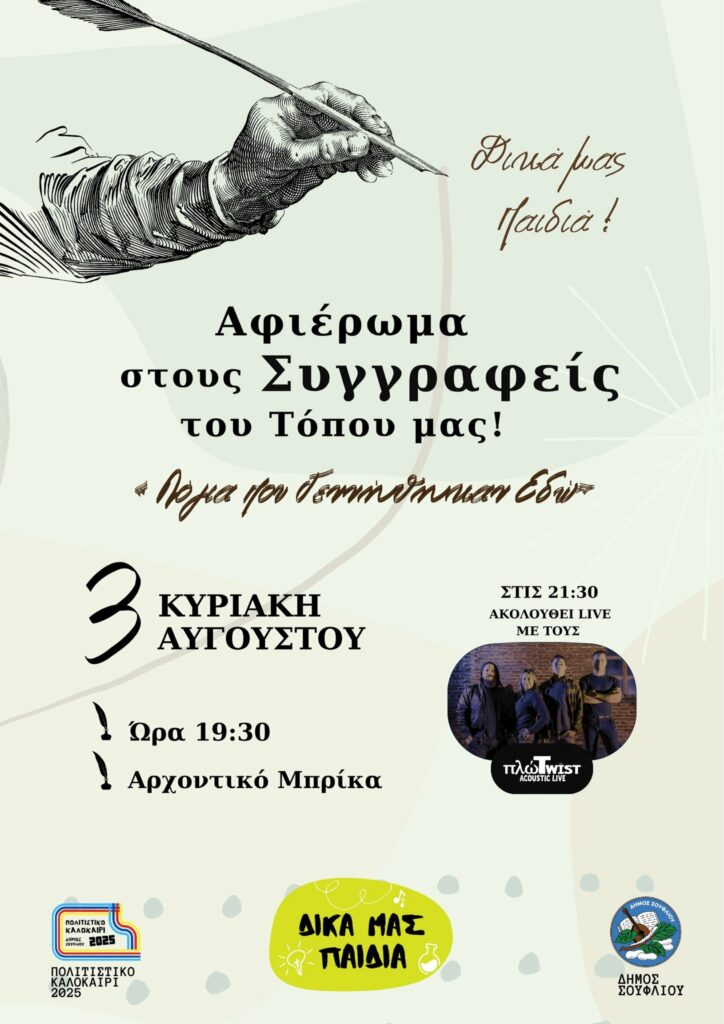 Ώρα: 19:30 – Αφιέρωμα στους συγγραφείς του τόπου μας