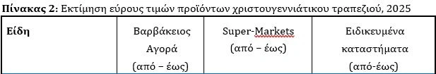 Το ΙΝ.ΕΜ.Υ. της ΕΣΕΕ πραγματοποίησε, κατά το διάστημα 15-17 Δεκεμβρίου 2025, ενδεικτική καταγραφή των τιμών πώλησης των προϊόντων του χριστουγεννιάτικου τραπεζιού, με τη μέθοδο της επιτόπιας παρατήρησης σε εμπορικές αγορές της Αττικής και διαμέσου τηλεφωνικής συνέντευξης για τη Θεσσαλονίκη.
