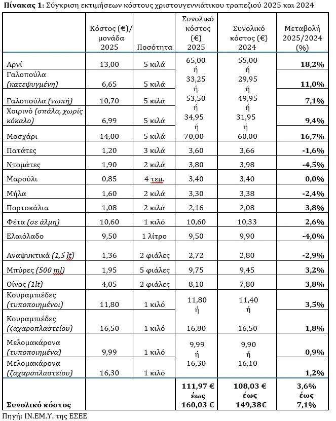 Όπως αναφέρει σε ανακοίνωση της η ΕΣΕΕ, πρόκειται για μεταβολή της τάξης του 3,6% έως 7,1% σε σύγκριση με το αντίστοιχο τραπέζι του 2024.