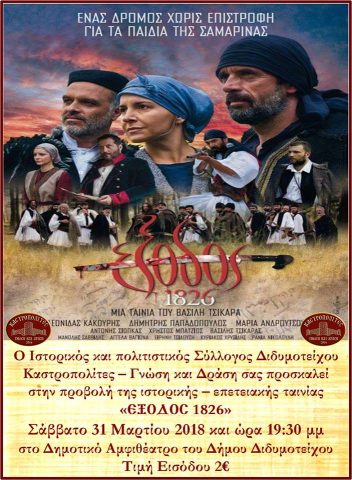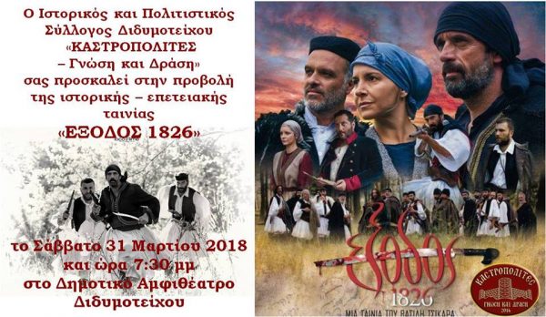Ο Ιστορικός και Πολιτιστικός Σύλλογος Διδυμοτείχου «ΚΑΣΤΡΟΠΟΛΙΤΕΣ – Γνώση και Δράση» με την ευκαιρία του εορτασμού της Εθνικής Επετείου της 25ης Μαρτίου και με της γενέθλιας ημέρας του Συλλόγου την 30η Μαρτίου, σας προσκαλεί στην προβολή της ιστορικής – επετειακής ταινίας «ΕΞΟΔΟΣ 1826», το Σάββατο 31 Μαρτίου 2018 και ώρα 7:30 μμ στο Δημοτικό Αμφιθέατρο Διδυμοτείχου.