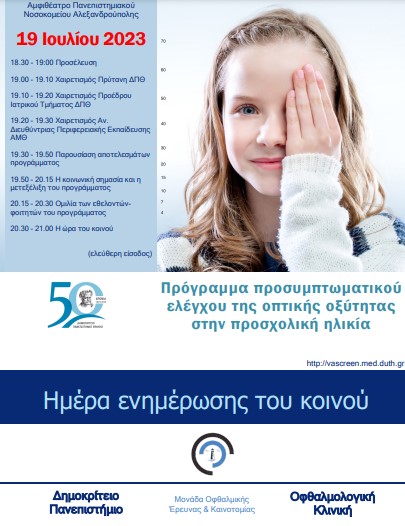 Η Πανεπιστημιακή Οφθαλμολογική Κλινική του Π.Γ.Ν. Αλεξανδρούπολης διοργανώνει την «Ημέρα Ενημέρωσης του Κοινού» στα πλαίσια του προγράμματος «Προσυμπτωματικός Έλεγχος της Οπτικής Οξύτητας στην Προσχολική Ηλικία».