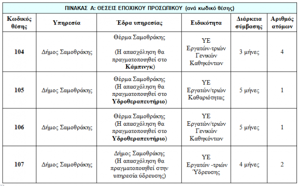 Ο Δήμος Σαμοθράκης ανακοινώνει την πρόσληψη, με σύμβαση εργασίας ιδιωτικού δικαίου ορισμένου χρόνου, συνολικά έντεκα (11) ατόμων για την κάλυψη εποχικών ή παροδικών αναγκών με την παροχή υπηρεσιών έναντι αντιτίμου και δύο (2) ατόμων με παροχή υπηρεσιών ανταποδοτικού χαρακτήρα του Δήμου Σαμοθράκης, που εδρεύει στη Χώρα Σαμοθράκης.