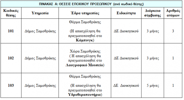 Ο Δήμος Σαμοθράκης ανακοινώνει την πρόσληψη, με σύμβαση εργασίας ιδιωτικού δικαίου ορισμένου χρόνου, συνολικά έντεκα (11) ατόμων για την κάλυψη εποχικών ή παροδικών αναγκών με την παροχή υπηρεσιών έναντι αντιτίμου και δύο (2) ατόμων με παροχή υπηρεσιών ανταποδοτικού χαρακτήρα του Δήμου Σαμοθράκης, που εδρεύει στη Χώρα Σαμοθράκης.