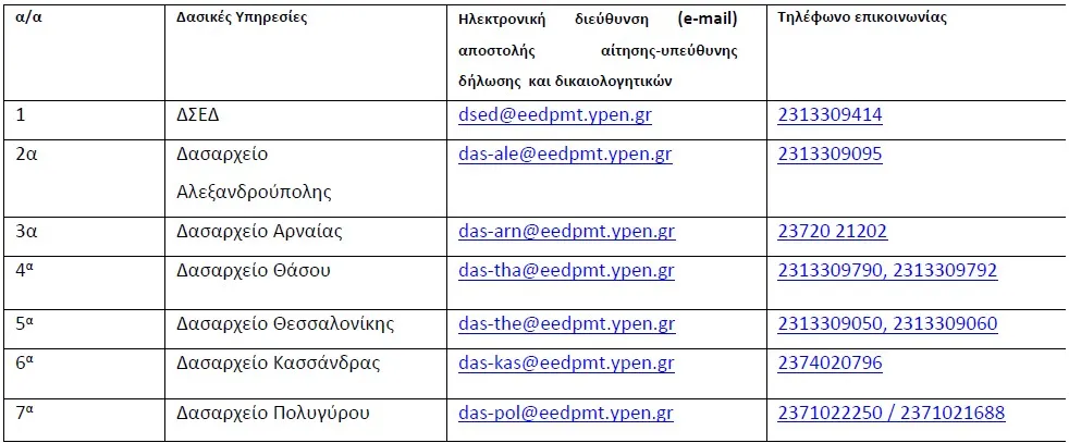 Τα δικαιολογητικά των ενδιαφερομένων αποστέλλονται μόνο με ηλεκτρονικό ταχυδρομείο στις ως άνω τοπικές δασικές υπηρεσίες της ΕΕΔΠ, για τις οποίες εκφράζουν το ενδιαφέρον τους.