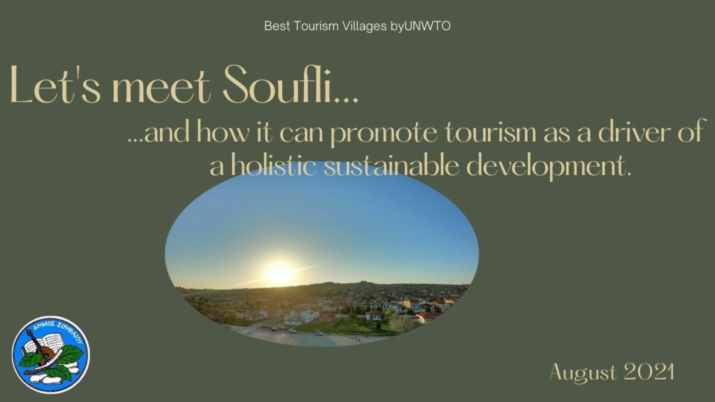 Με στόχο την ανάδειξη αυτής ακριβώς της πτυχής του τουρισμού, ο Δήμος Σουφλίου άδραξε την ευκαιρία και υπέβαλε ολοκληρωμένη πρόταση, συγγεγραμμένη στην αγγλική γλώσσα, για την ένταξη του Σουφλίου στον διαγωνισμό “BESTTOURISMVILLAGES” που διοργανώνει ο Παγκόσμιος Οργανισμός Τουρισμού, για τον οποίο ενημερώθηκε από την ως άνω επιστολή.