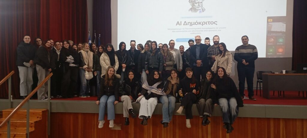 Την Τρίτη 13 Ιανουαρίου 2026, στο Κεντρικό Αμφιθέατρο του Τμήματος Ψυχολογίας στο Διδυμότειχο, παρουσιάστηκε επίσημα η εφαρμογή AI Δημόκριτος, με συμμετοχή φοιτητών και μελών της ακαδημαϊκής κοινότητας που παρακολούθησαν με έντονο ενδιαφέρον.