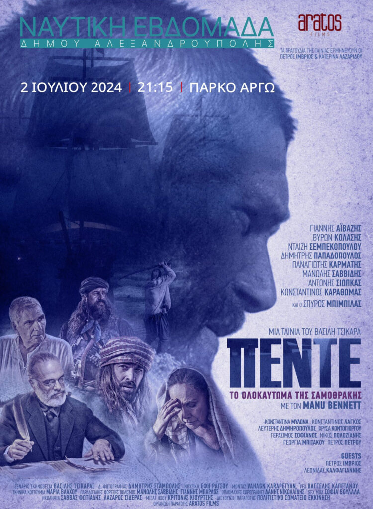 Στο πλαίσιο των εκδηλώσεων της Ναυτικής Εβδομάδας που διοργανώνει ο Δήμος Αλεξανδρούπολης, την Τρίτη 2 Ιουλίου και ώρα 21:00 θα πραγματοποιηθεί η προβολή της ταινίας με τίτλο «ΠΕΝΤΕ. Το ολοκαύτωμα της Σαμοθράκης» στο πάρκο «ΑΡΓΩ» (απέναντι από τη Μεραρχία) στην παραλία με ελεύθερη είσοδο για όλους.