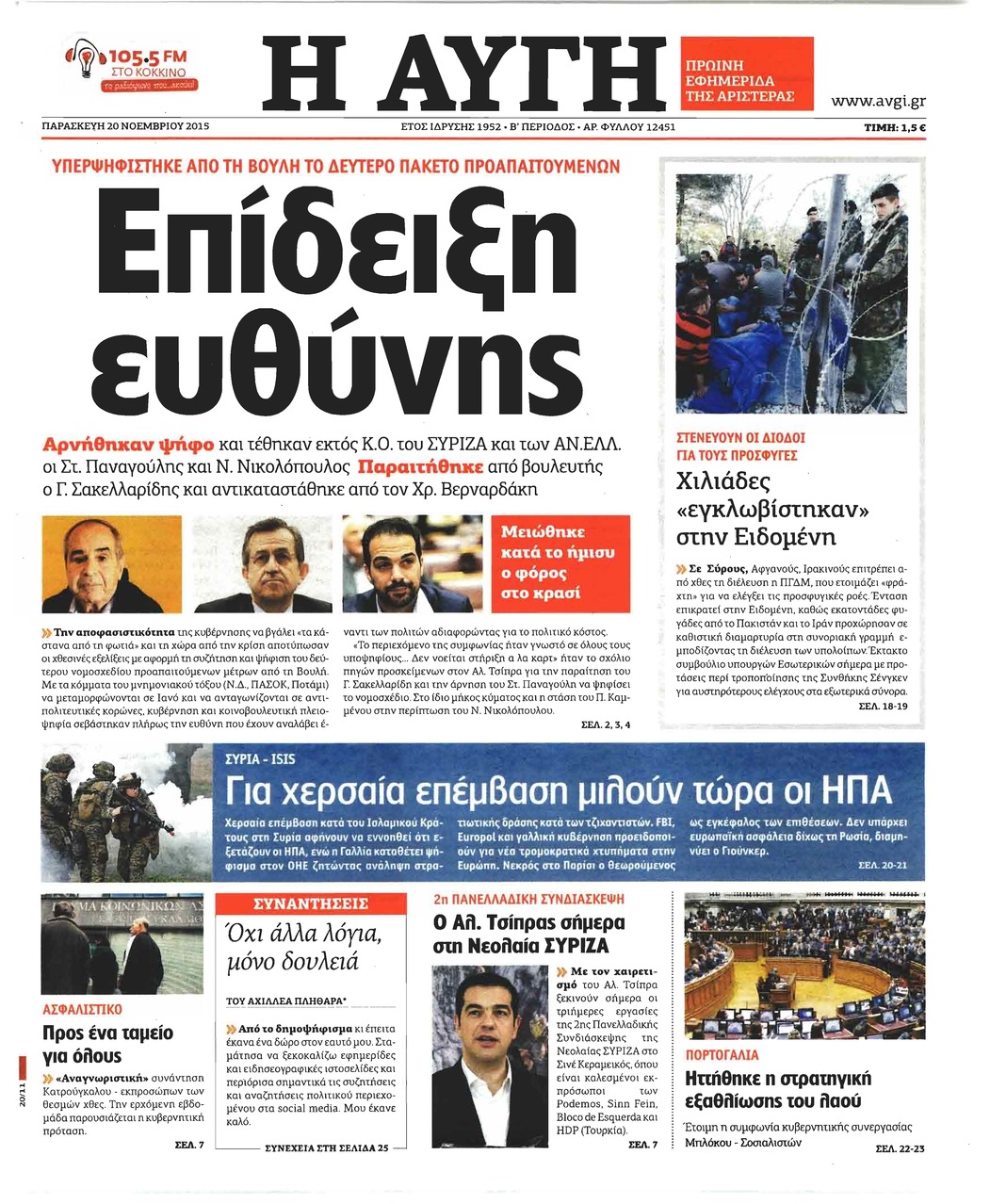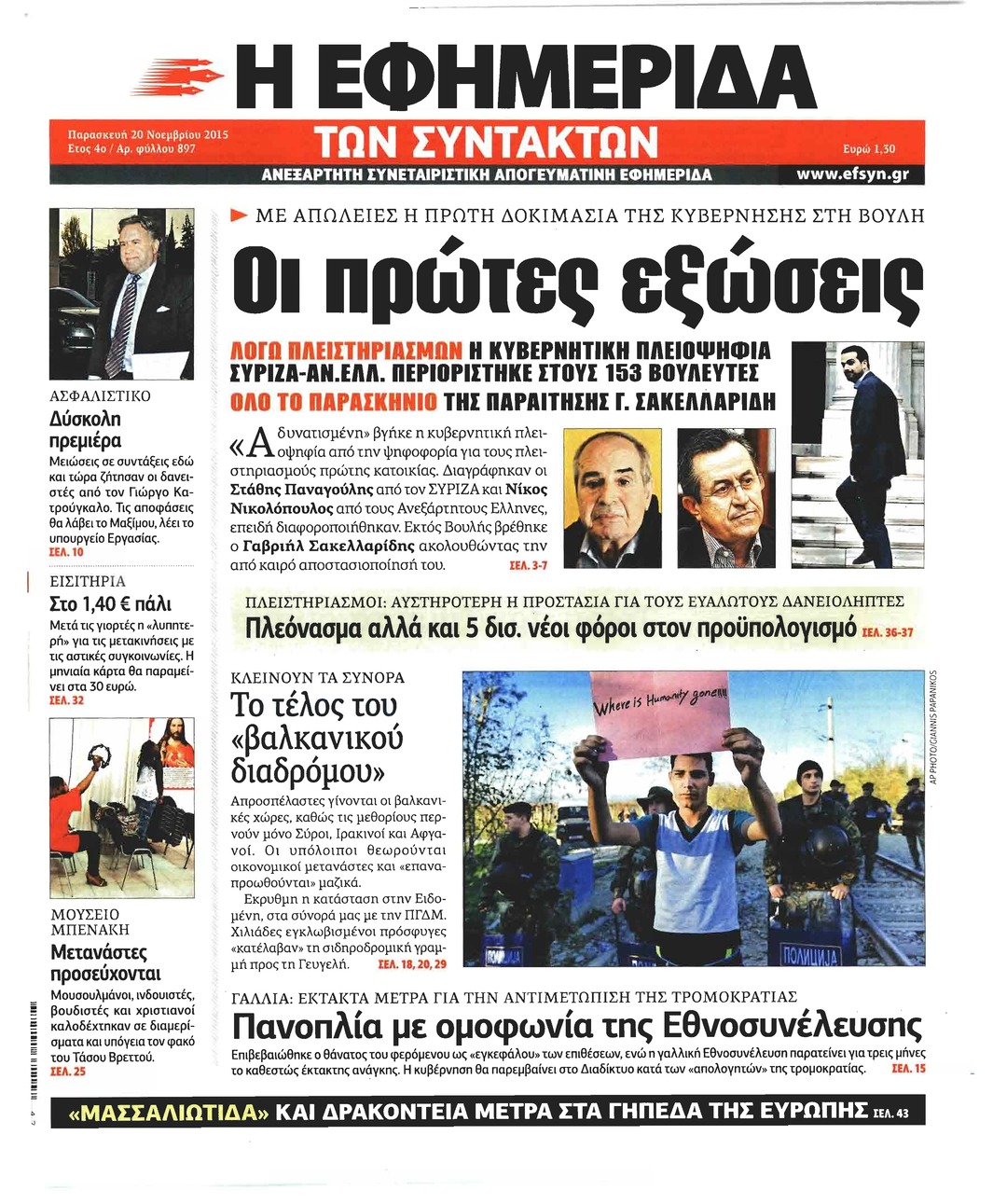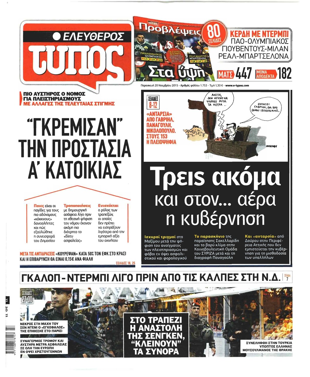Πρωτοσέλιδα του ελληνικού Τύπου 20/11/2015