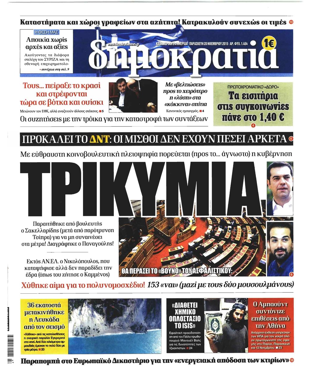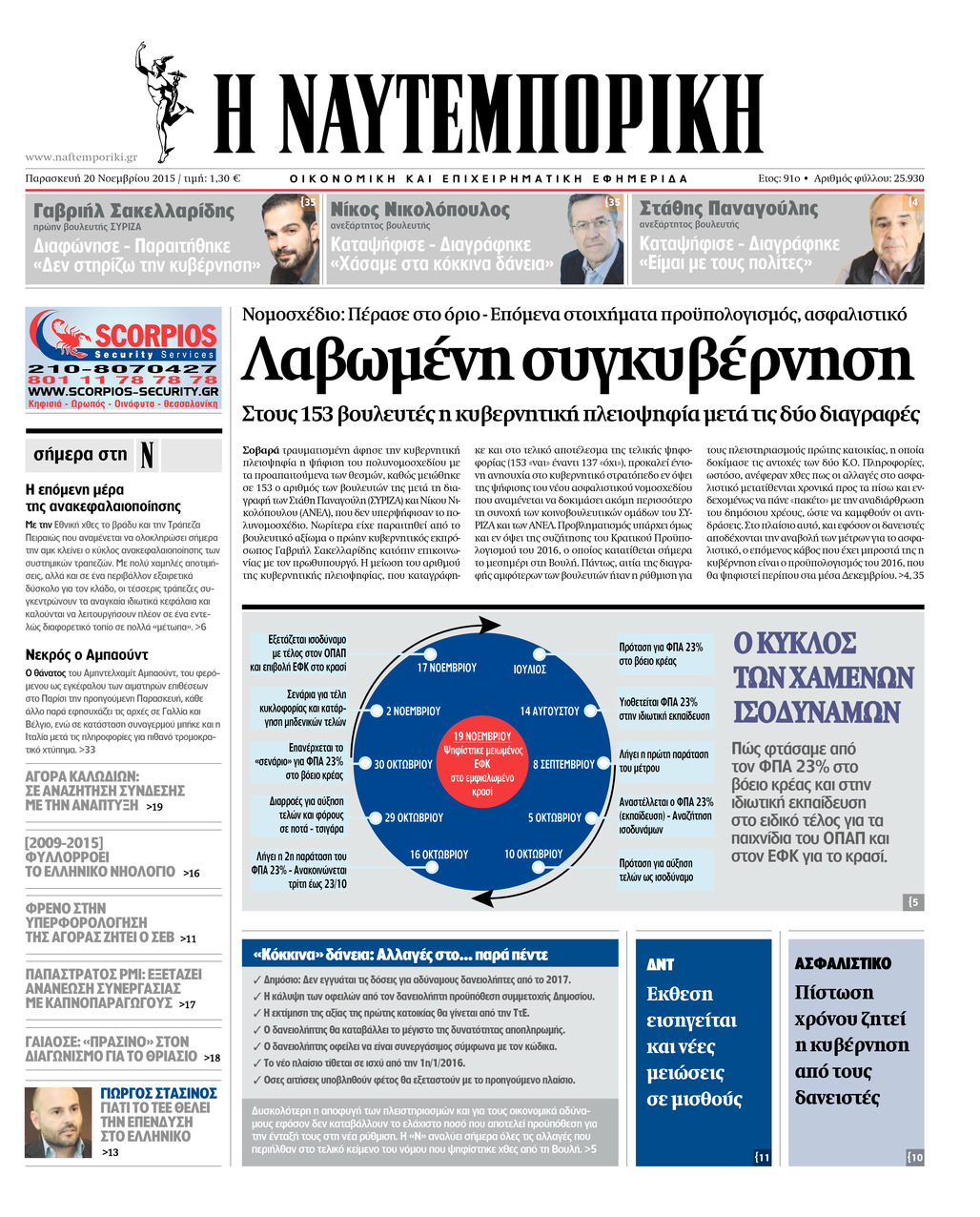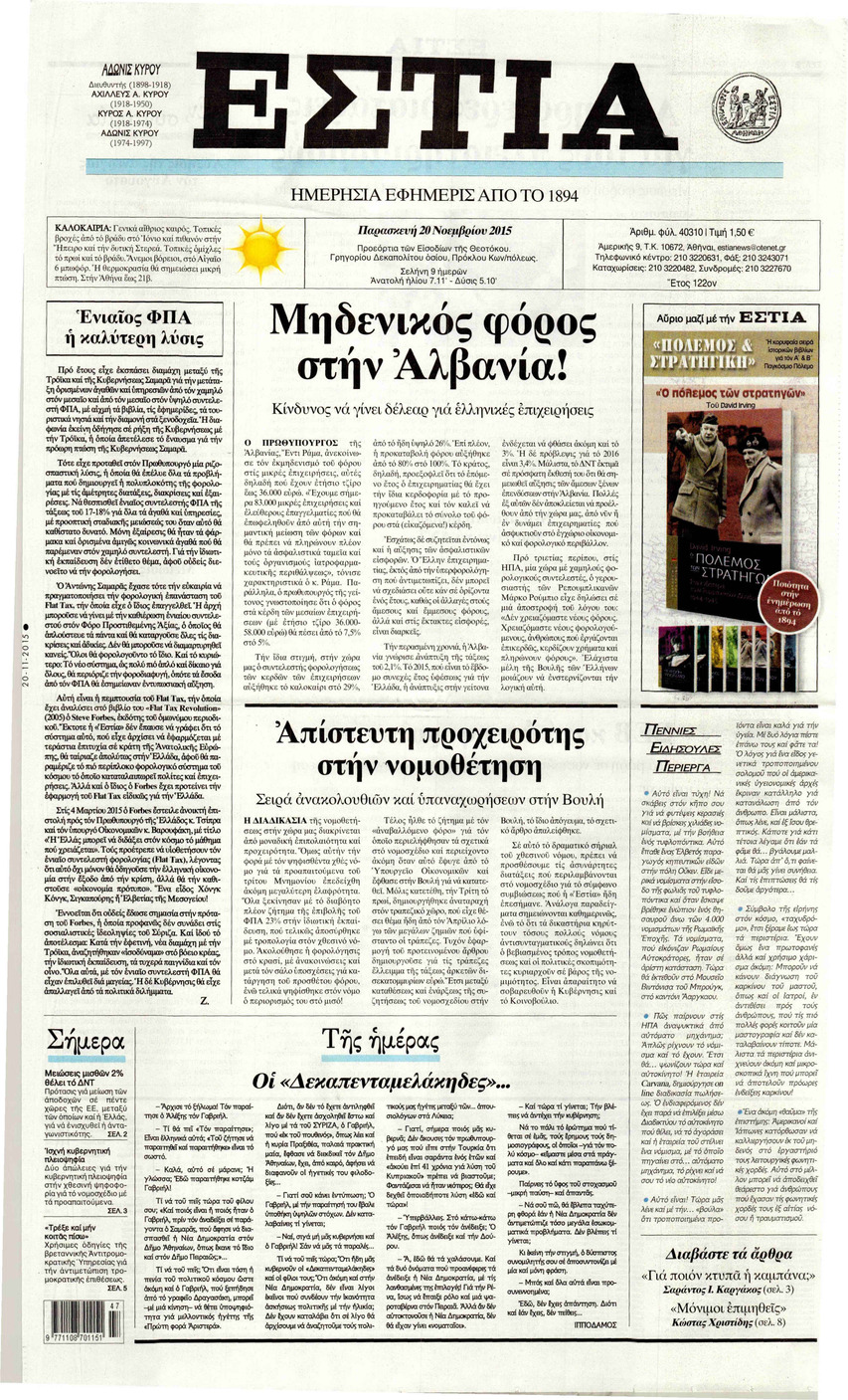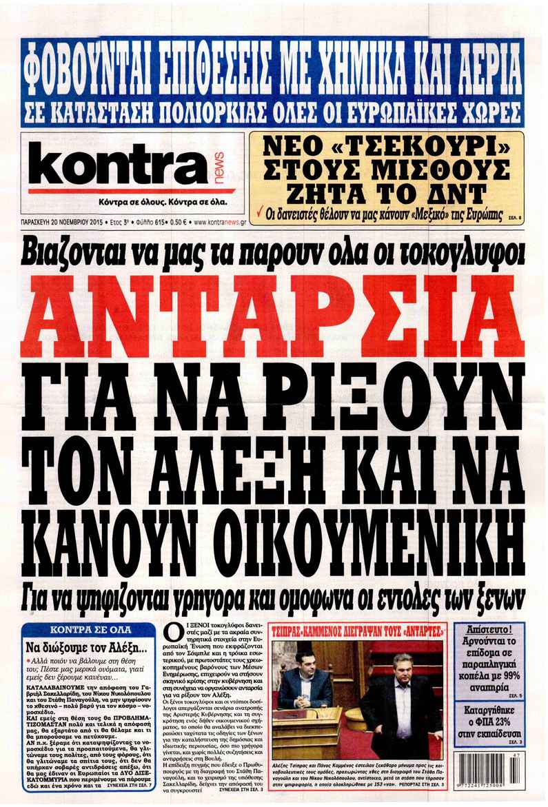 Πρωτοσέλιδα του ελληνικού Τύπου 20/11/2015
