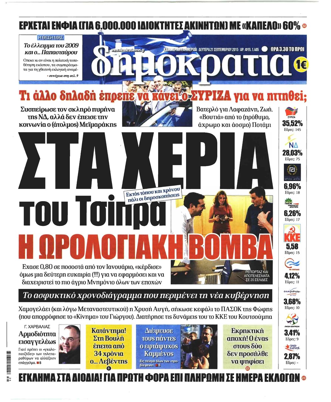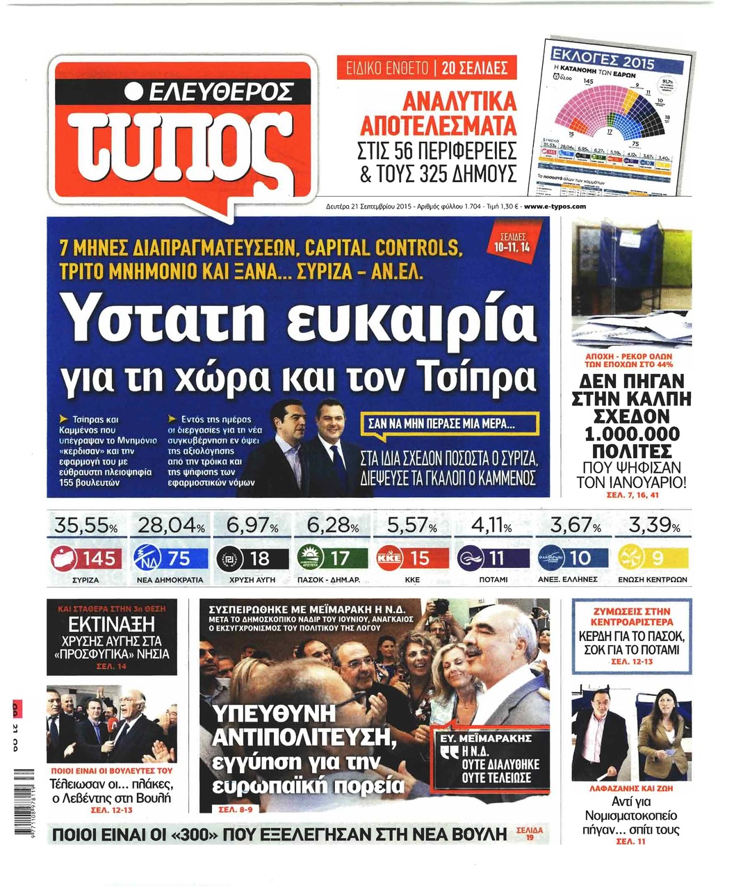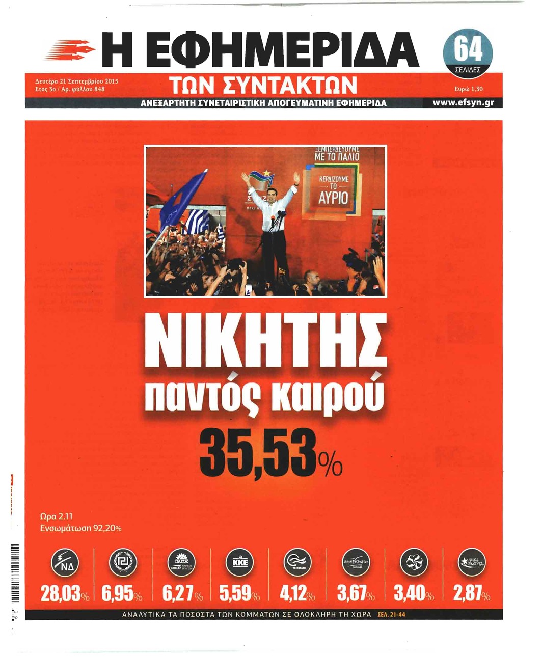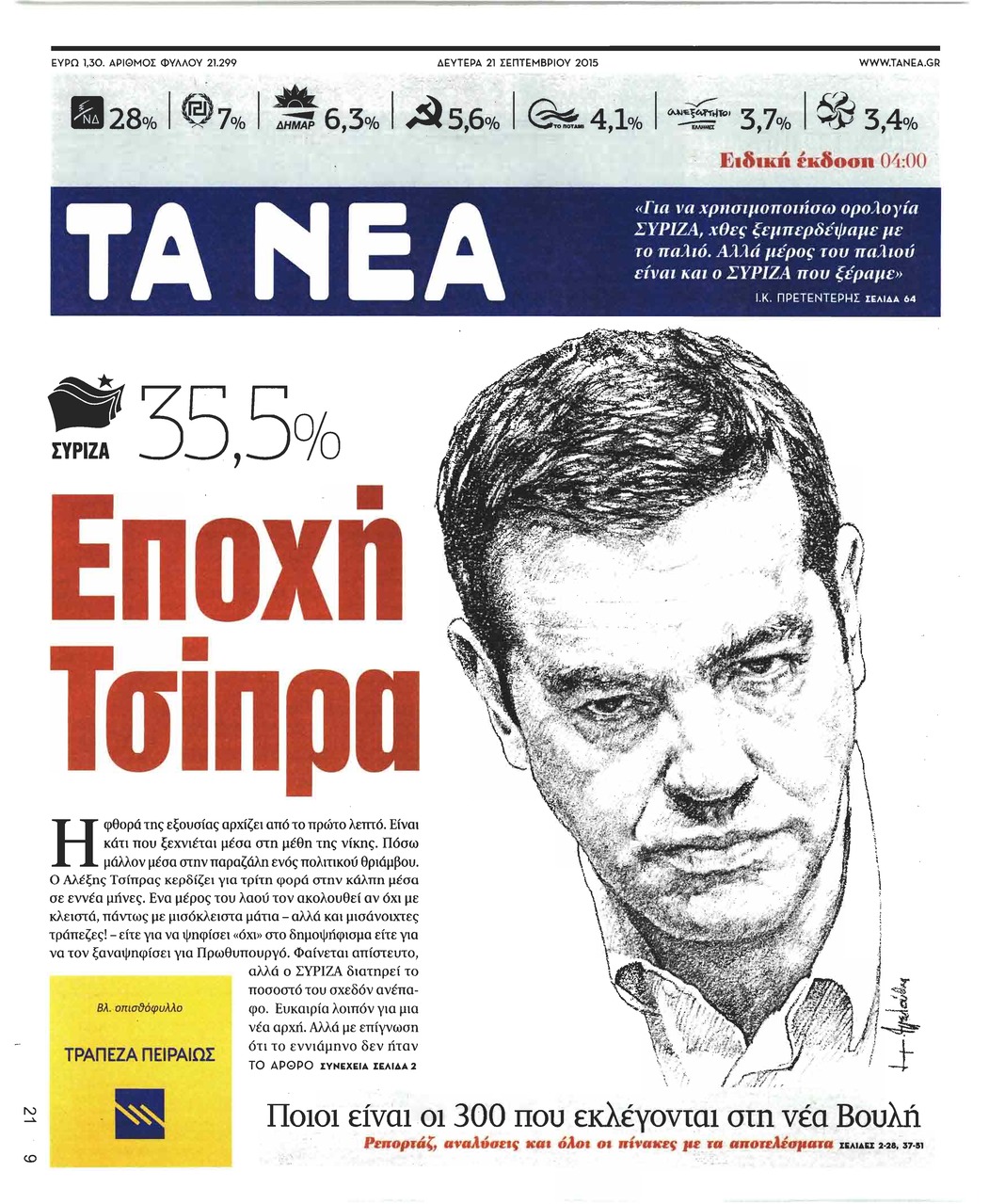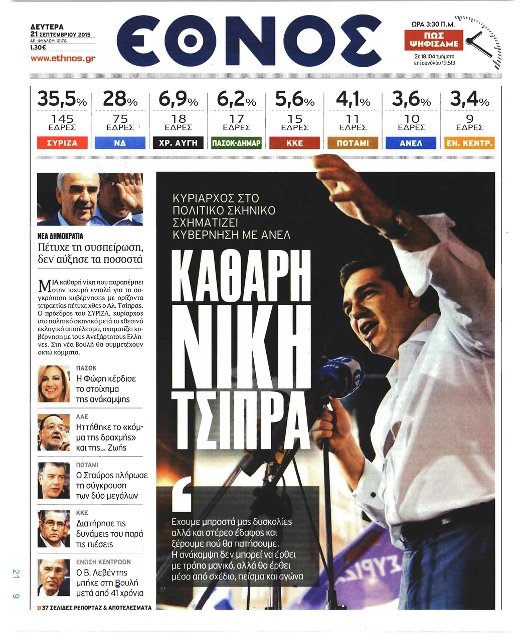 Πρωτοσέλιδα του ελληνικού Τύπου 21/09/2015