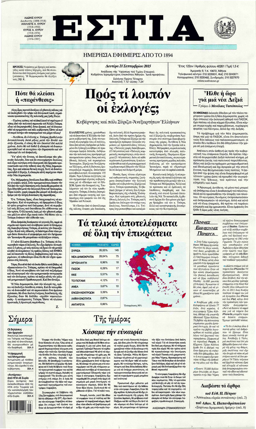 Σύμφωνα με την εφημερίδα “το εκλογικό αποτέλεσμα, κατά κοινή ομολογία, αποτελεί περίλαμπρη νίκη του ΣΥΡΙΖΑ και προσωπικά του Αλ. Τσίπρα. Η αποχή στις τωρινές εκλογές έφτασε στο 44% του εκλογικού σώματος, όπως αυτό αποτυπώνεται στους εκλογικούς καταλόγους”.