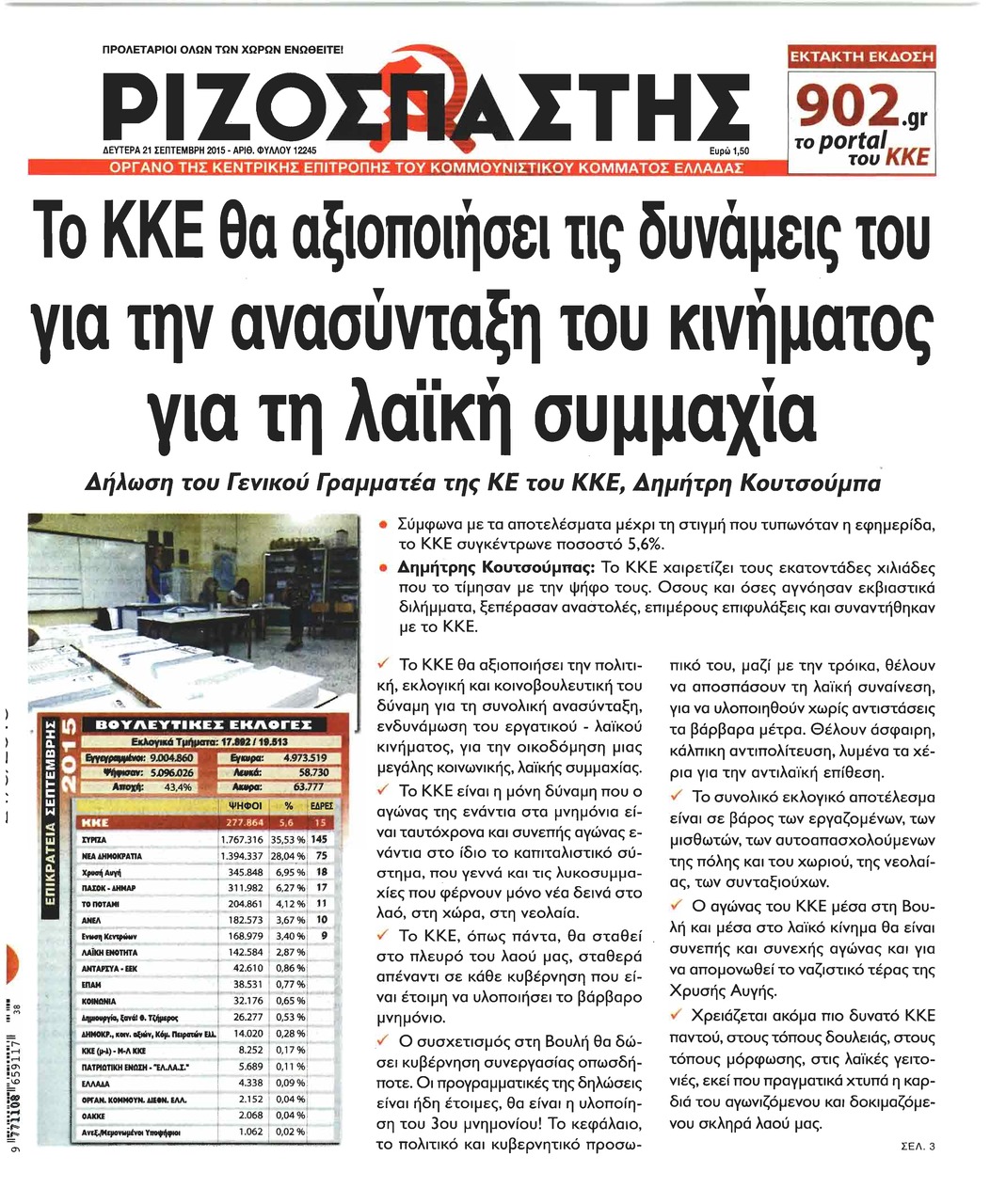 Η εφημερίδα επισημαίνει ότι : “το ΚΚΕ θα αξιοποιήσει την πολιτική, εκλογική και κοινοβουλευτική του δύναμη για τη συνολική ανασύνταξη, ενδυνάμωση του εργατικού-λαϊκού κινήματος, για την οικοδόμηση μιας μεγάλης κοινωνικής, λαϊκής συμμαχίας”.