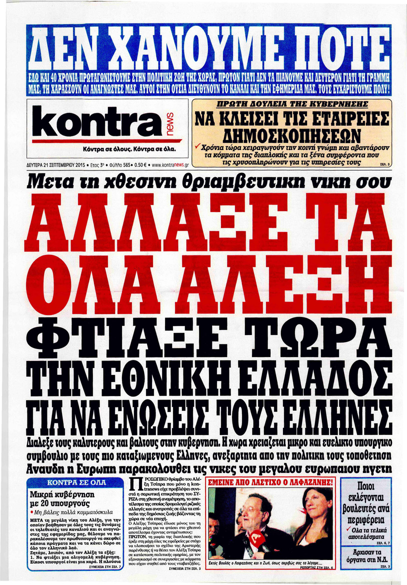Σύμφωνα με την εφημερίδα “προσωπικό θρίαμβο του Αλέξη Τσίπρα που μόνο η kontranews είχε προβλέψει συνιστά η σαρωτική επικράτηση του ΣΥΡΙΖΑ στη χθεσινή αναμέτρηση, το αποτέλεσμα της οποίας δρομολογεί ριζικές αλλαγές και ανατροπές σε όλα τα επίπεδα της δημόσιας ζωής βάζοντας τη χώρα σε νέα εποχή”.