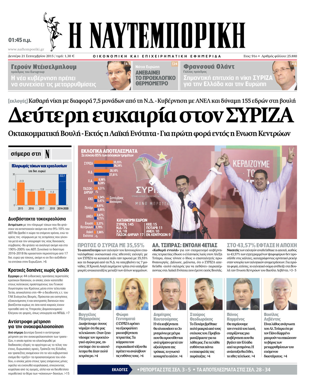 Η εφημερίδα γράφει ότι: «το χθεσινό καθαρό εκλογικό αποτέλεσμα οδηγεί χωρίς χρονοτριβή στον σχηματισμό νέας κυβέρνησης, η οποία θα πρέπει να ξεκινήσει άμεσα την εφαρμογή του τρίτου Μνημονίου που ψηφίστηκε τον Αύγουστο από τη Βουλή».