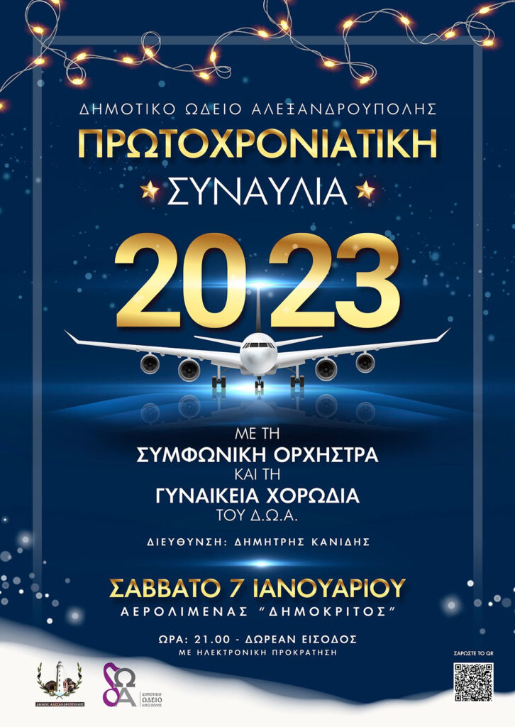 Ο Δήμος Αλεξανδρούπολης με το Δημοτικό Ωδείο μετά την επιτυχημένη επετειακή συναυλία με θέμα τη «Συμπλήρωση 100 χρόνων από την προσάρτηση της Αλεξανδρούπολης στον εθνικό κορμό», πραγματοποιεί το Σάββατο 7 Ιανουαρίου 2023 και ώρα 21.00, μεγάλη Πρωτοχρονιάτικη Εορταστική Συναυλία ξανά στον Διεθνή Κρατικό Αερολιμένα Αλεξανδρούπολης «ΔΗΜΟΚΡΙΤΟΣ».