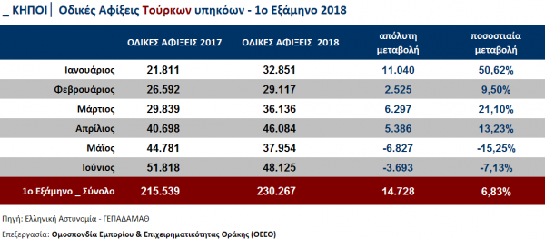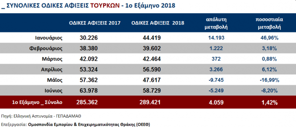 Ωστόσο, σε επίπεδο εξαμήνου καταγράφεται οριακή αύξηση 1,42% για το τρέχον έτος, σε σχέση με το πρώτο εξάμηνο του 2017, με 289.421 Τούρκους υπηκόους να εισέρχονται στην Ελλάδα από τις δύο οδικές πύλες εισόδου στο Νομό Έβρου.