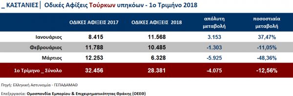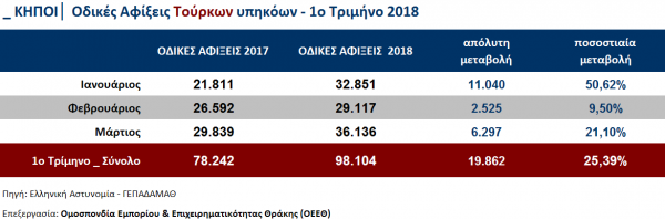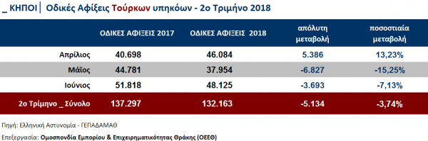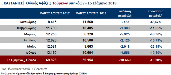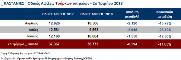 Τα παραπάνω στοιχεία συμπεριλαμβάνονται στο δελτίο οδικών αφίξεων Τούρκων υπηκόων στην Ελλάδα για το δεύτερο τρίμηνο του 2018, της Ομοσπονδίας Εμπορίου και Επιχειρηματικότητας Θράκης (ΟΕΕΘ), από τα συνοριακά σημεία διέλευσης των Κήπων και των Καστανέων.