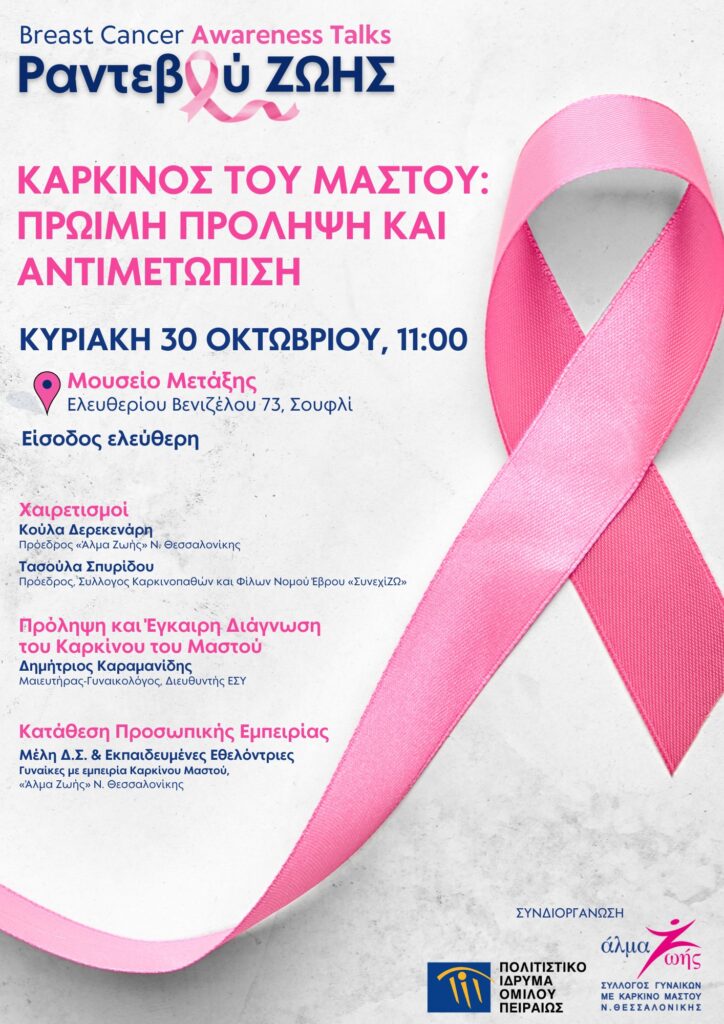 Με αφορμή την Παγκόσμια Ημέρα Κατά του Καρκίνου του Μαστού (25/10), ο Σύλλογος Γυναικών με Καρκίνο του Μαστού «Άλμα Ζωής» Νομού Θεσσαλονίκης, σε συνεργασία με το Σύλλογο Καρκινοπαθών και Φίλων Νομού Έβρου “ΣυνεχίΖΩ” και με το Πολιτιστικό Ίδρυμα Ομίλου Πειραιώς (ΠΙΟΠ), διοργανώνει την Κυριακή Ενημερωτική Συνάντηση σχετικά με τη σπουδαιότητα της πρόληψης και έγκαιρης διάγνωσης της νόσου.
