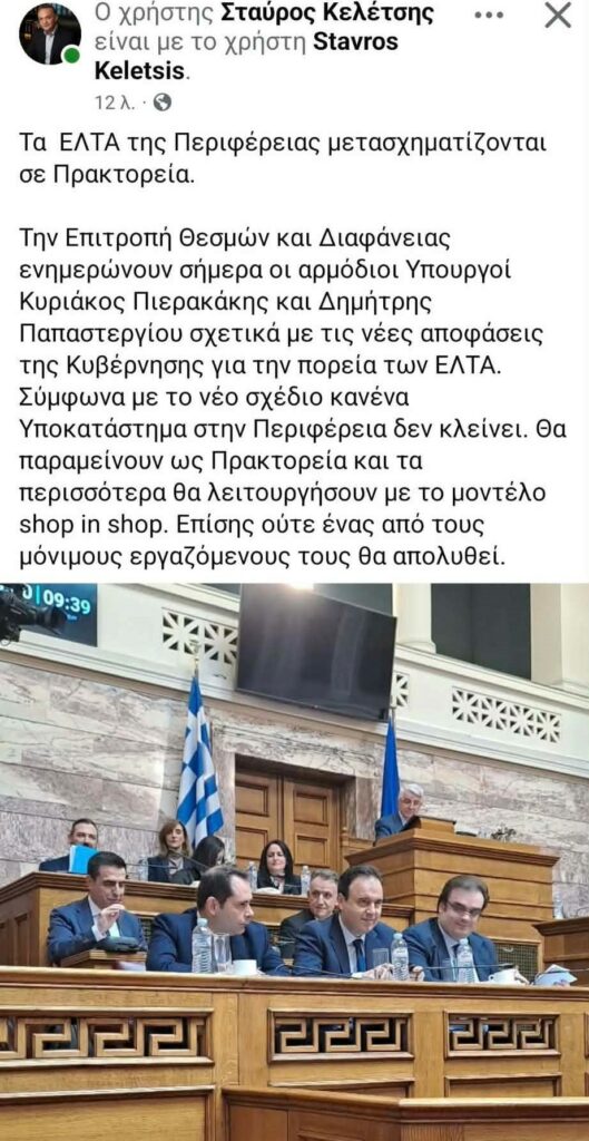 Με ανάρτησή του στα μέσα κοινωνικής δικτύωσης ο κ. Κελέτσης αναφέρει πως οι αρμόδιοι Υπουργοί Κυριάκος Πιερακάκης και Δημήτρης Παπαστεργίου ενημερώνουν σήμερα Πέμπτη 18/12 την Επιτροπή Θεσμών και Διαφάνειας σχετικά με τις νέες αποφάσεις της Κυβέρνησης για την πορεία των ΕΛΤΑ.