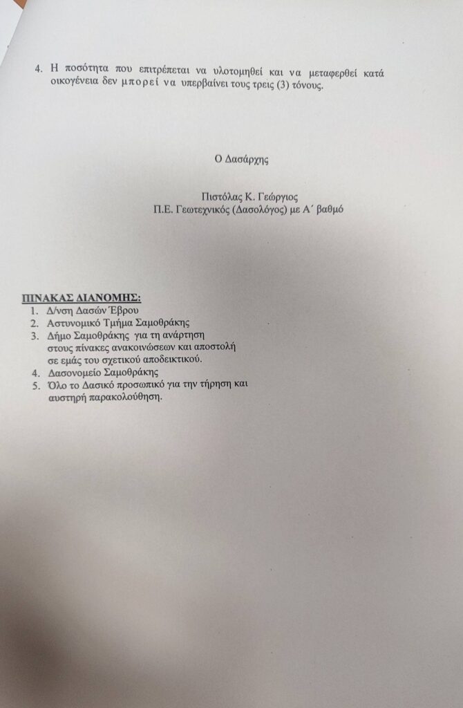 Τα καυσόξυλα διατίθενται αποκλειστικά για την κάλυψη ατομικών αναγκών των κατοίκων και απαγορεύεται η διάθεσή τους για εμπορία.