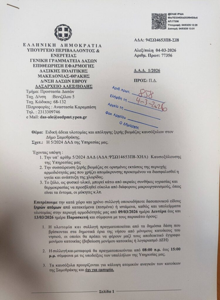 Ο Δήμος Σαμοθράκης ενημερώνει ότι, κατόπιν απόφασης του Δασαρχείου Αλεξανδρούπολης, επιτρέπεται η κατά χώρο και χρόνο συλλογή ξηρής δασικής βιομάζας (καυσόξυλων) από τα δημόσια δάση (πεσμένων ή ιστάμενων) εντός των διοικητικών ορίων του Δήμου Σαμοθράκης.